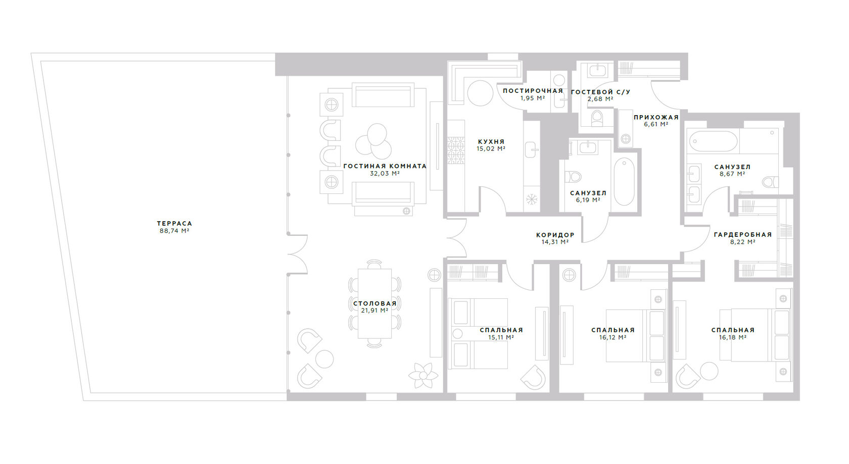 Функциональной планировкой предусмотрена гостиная, кухня с постирочной, столовая, мастер-спальня с ванной комнатой и гардеробной, две спальни с общей ванной комнатой, гостевой санузел.